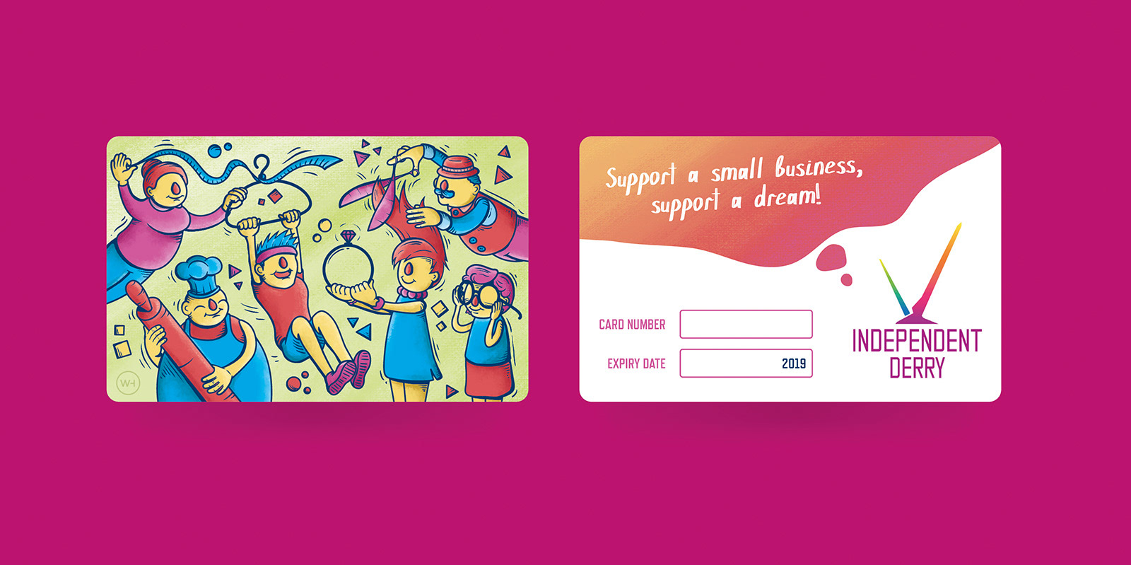 The Independent Derry Card offers a wide range of discounts while promoting and supporting local businesses. Each year, the card is redesigned, and for the 2018 edition, the challenge was to illustrate a variety of local professions in a fun style.