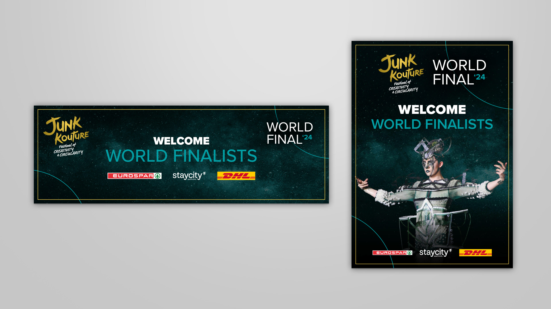Junk Kouture is a competition for secondary school students, challenging them to design and create fashion pieces entirely from recycled materials. Its mission is to raise awareness of sustainability while empowering young people to push their creativity and think beyond conventional fashion. Each year, the competition culminates in a prestigious World Final, where the World Designer of the Year is crowned from hundreds of international entrants. For the 2024 edition, the client required a wide range of printed and digital promotional materials to build anticipation ahead of the event and support its delivery on the day. Because the Junk Kouture brand reinvents itself on a yearly cycle, a consistent visual direction was established to unify the campaign while making the World Final identity distinct, yet unmistakably aligned with Junk Kouture.