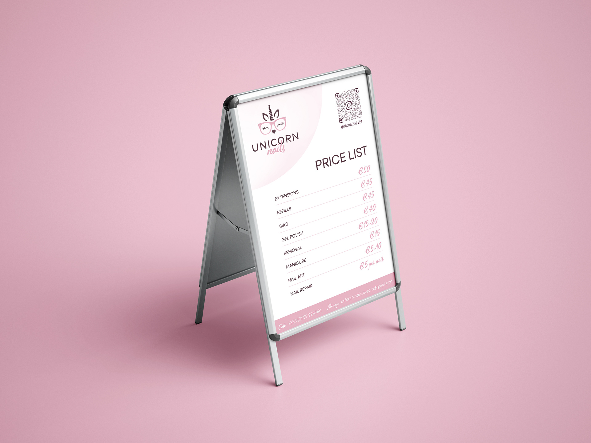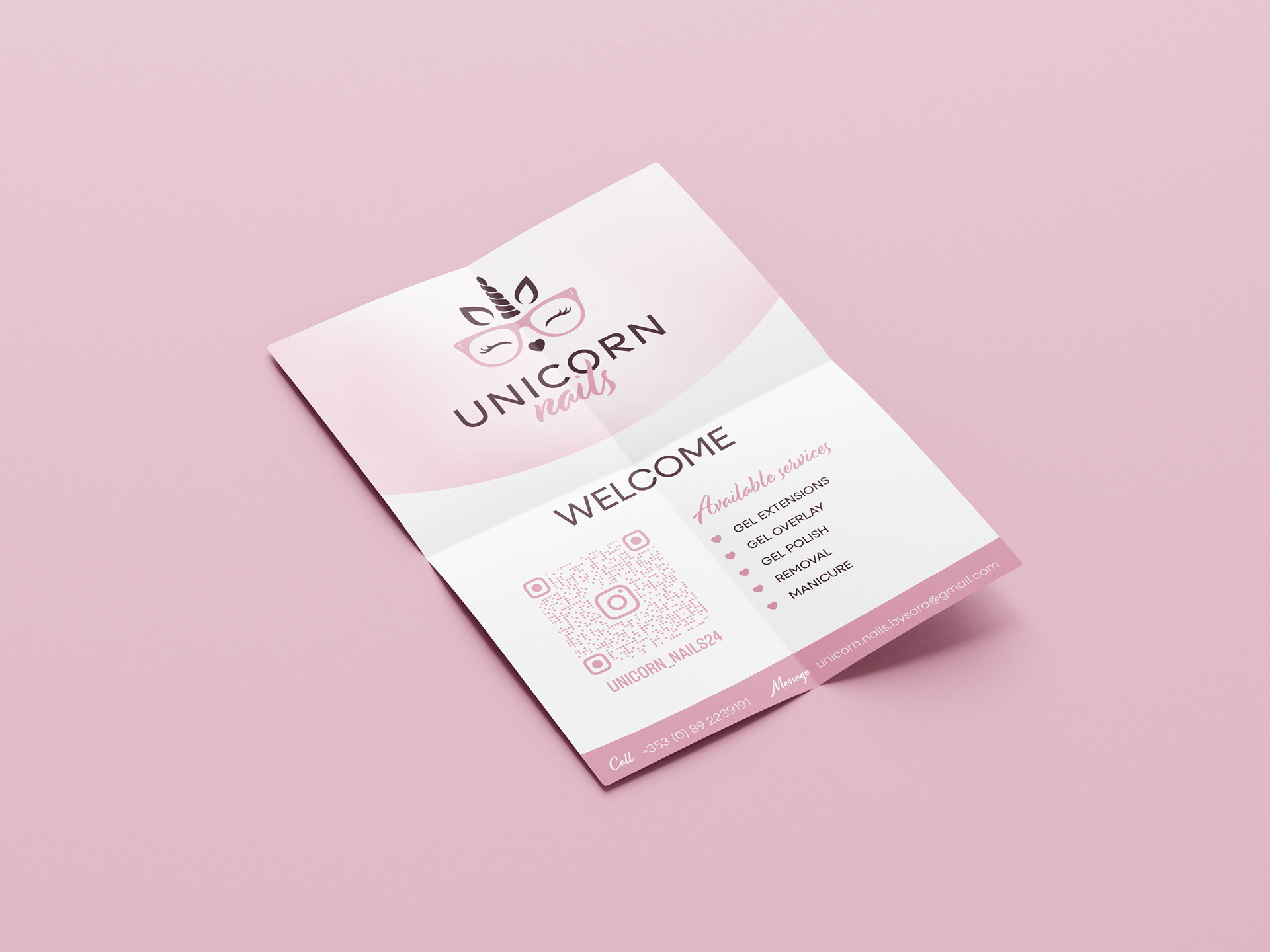 Unicorn Nails, a local nail and beauty salon, required a brand identity that reflected its atmosphere and values. The design focused on capturing a look that was cute, friendly, approachable, elegant, and feminine, ensuring the visual style resonated with clients while clearly communicating the salon’s personality.